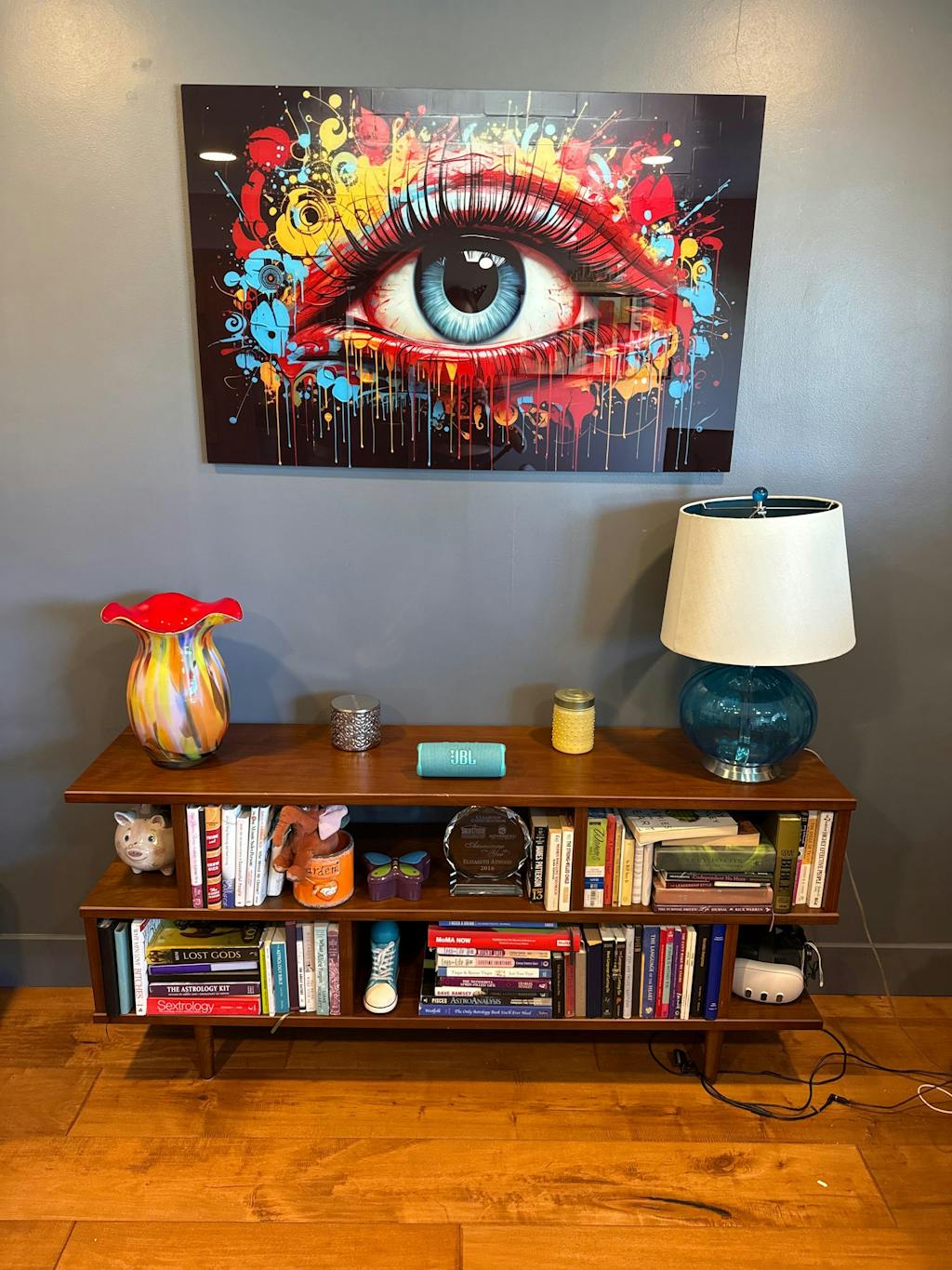 This piece is perfect for my office. I have been eyeballing (pun intended) it for a year to make sure it was “the one”. Art is a very important decision and makes a statement about who you are and also fills the space with the vibe you feel or want to feel. The colors and paint dripping takes it even to the next level for me. I wanted this for what it means to me….