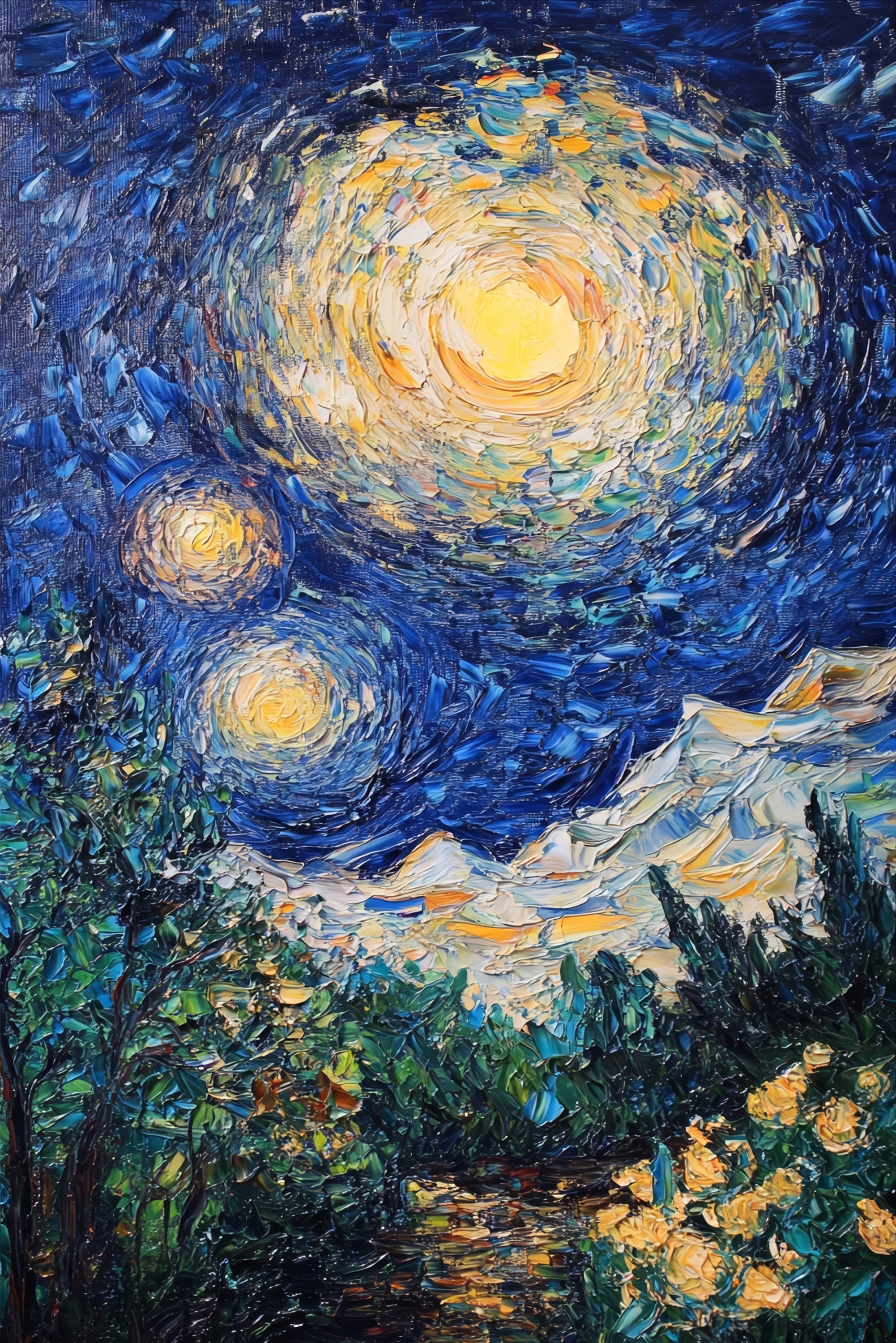 Forget flat wall art. Celestial Whorl is designed to be seen, felt, and experienced—a kinetic night-sky vortex where every stroke is built in real depth, then elevated with high-gloss lacquer highlights that glow under light.