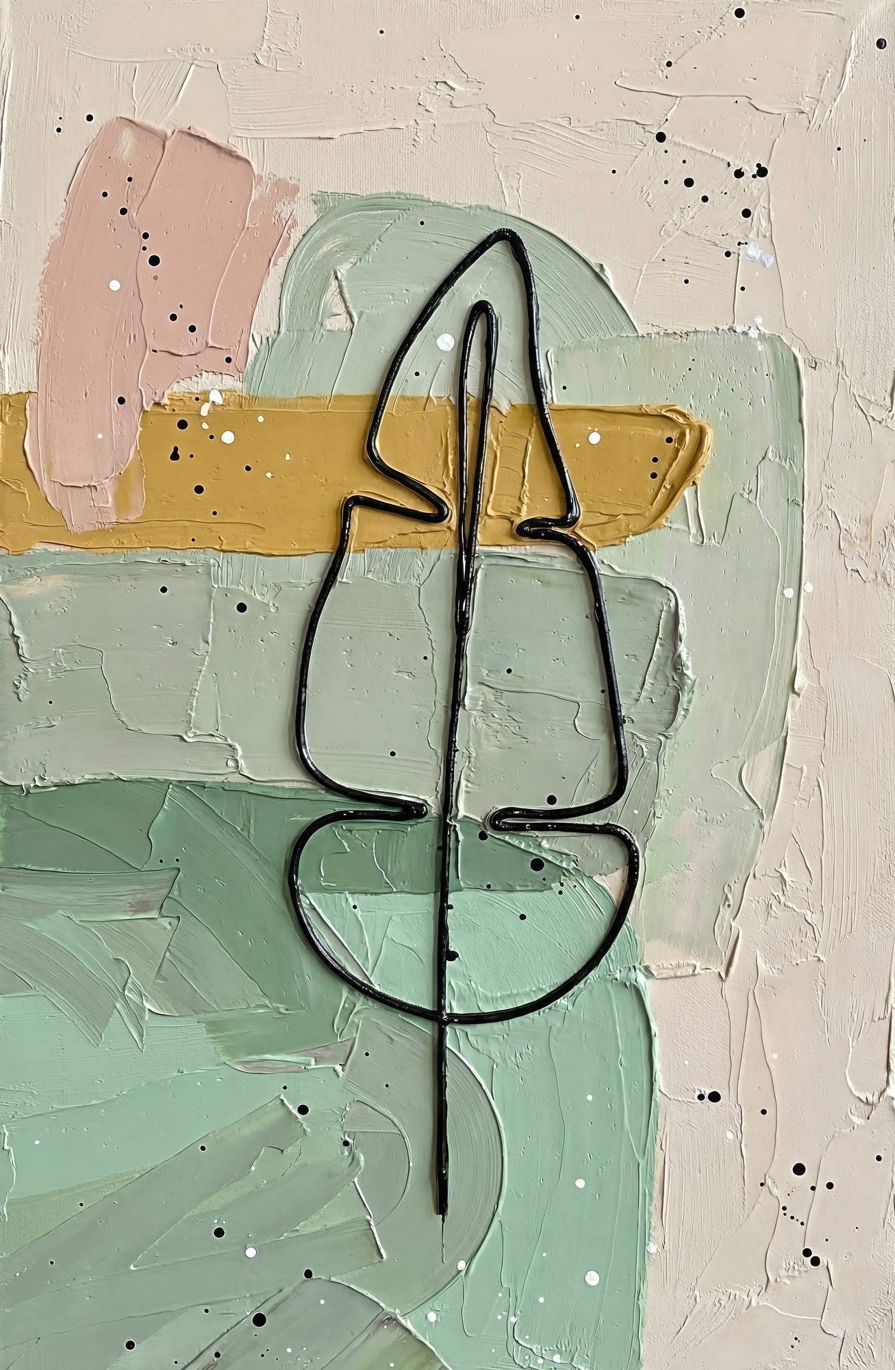 A contemporary dialogue between raw texture and minimalist line art. Sage & Petal Abstract Foliage features a continuous, hand-drawn black leaf outline set against a backdrop of heavily layered impasto blocks in sage green, dusty rose, and ochre. Utilizing our proprietary 3D haptic embossing on a premium aluminum panel, the contrast between the thick, rugged background and the smooth, raised line art creates a sophisticated gallery piece that explores the boundaries of botanical abstraction.